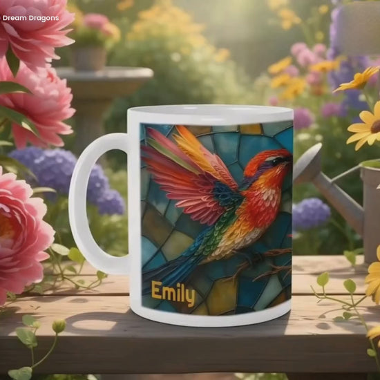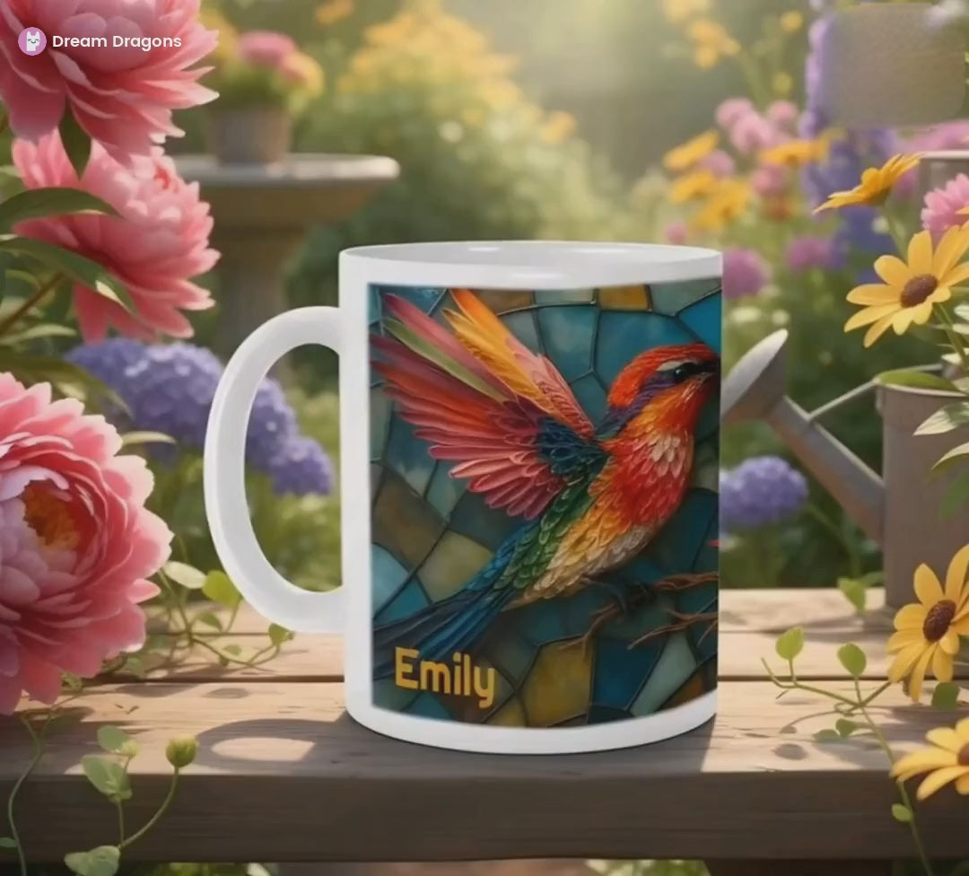 Personalized Stained Glass Hummingbird Coffee Mug: Bohemian Ceramic Tea Cup - Gift with Name