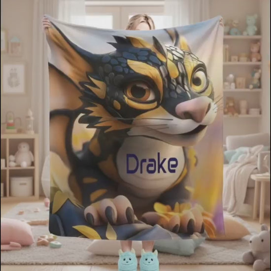 Enchanting, personalised dragon-themed children's blanket showcased as the perfect gift for special occasions, featuring a vibrant, detailed dragon design that sparks imagination and adventure. This high-quality blanket merges practicality with fantasy, making it an excellent addition to any child's room for both comfort and decoration. It serves as a magical accessory during story time, a warm companion during cold nights, or a festive decorative piece for a themed bedroom.