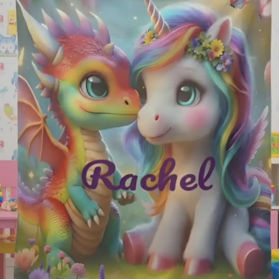 Wrap yourself or your loved ones in the enchanting warmth of this magical dragon and unicorn personalised blanket. Featuring a delightful design of a friendly golden dragon with sparkling eyes beside a gentle white unicorn with a rainbow mane, this blanket is bursting with colour, charm, and fantasy wonder. Surrounded by a meadow of bright flowers, this dreamy scene can be customised with any name, making it a truly unique and thoughtful gift. Whether for a little one's bedtime, a teen's cosy reading nook, a woman who adores whimsical décor, or even a beloved pet's snuggle spot, this blanket adds warmth, magic, and joy to every moment.